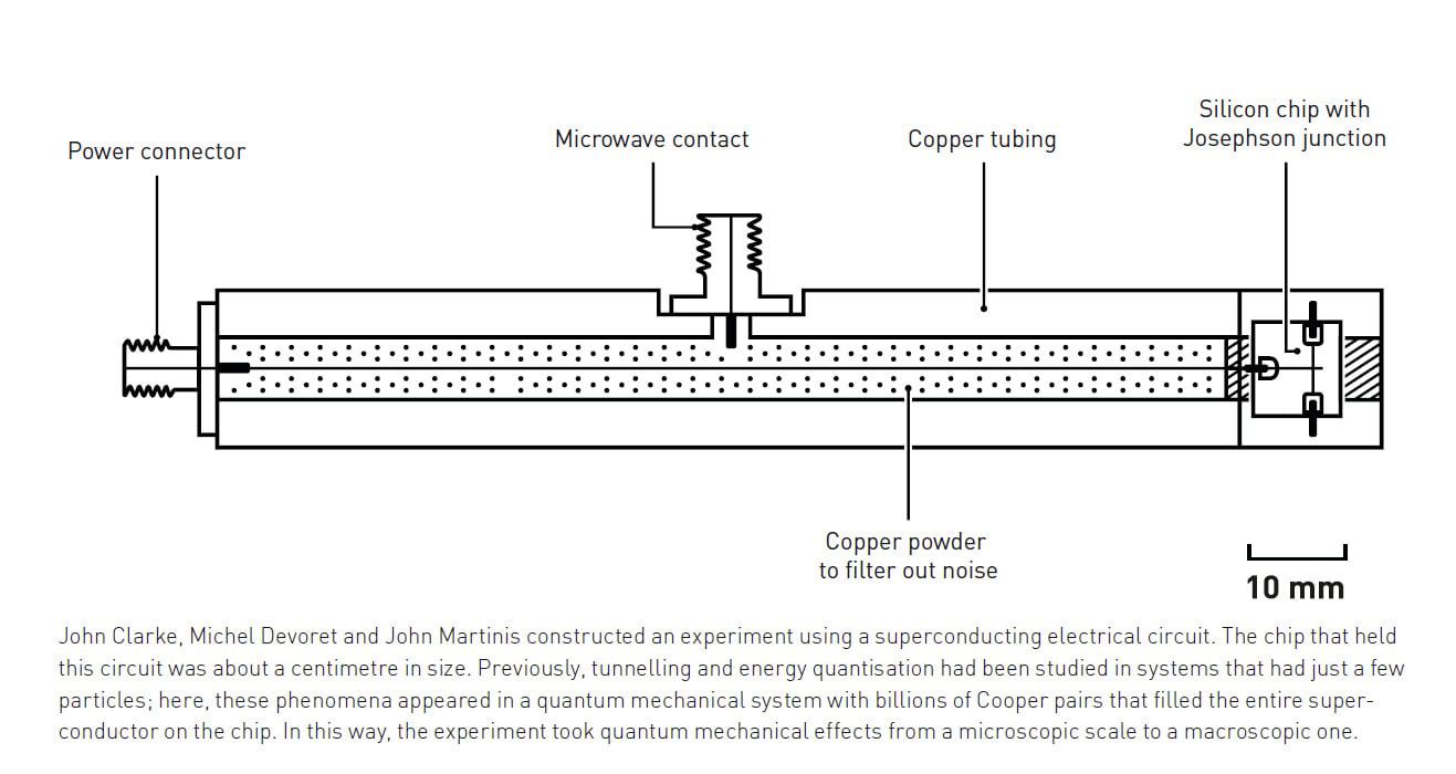 Как поясняется в пресс-релизе Нобелевского комитета, важнейший вопрос физики – максимальный размер системы, способной продемонстрировать квантово-механические эффекты. Лауреаты Нобелевской премии этого года провели эксперименты с электрической цепью, продемонстрировав как квантово-механическое туннелирование, так и квантовые уровни энергии в системе, размер которой позволяет ей уместиться в руке.