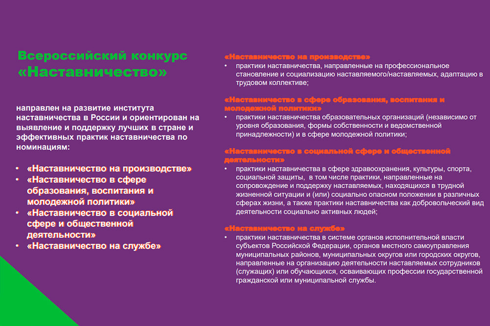 Для справки: Всероссийский конкурс «Наставничество» направлен на создание условий для развития института наставничества и ориентирован на выявление и поддержку, масштабирование и тиражирование лучших в стране практик наставничества. Партнёрами конкурса выступили Минобрнауки России, «Росмолодёжь», Ассоциация «Добро.рф», некоммерческие организации и институты общественного развития «Добро.рф», АНО «Центр знаний “Машук”», АНО «Россия – страна возможностей», РДДМ «Движение первых», Российское общество «Знание», МООО «РСО», «ОПОРА РОССИИ».