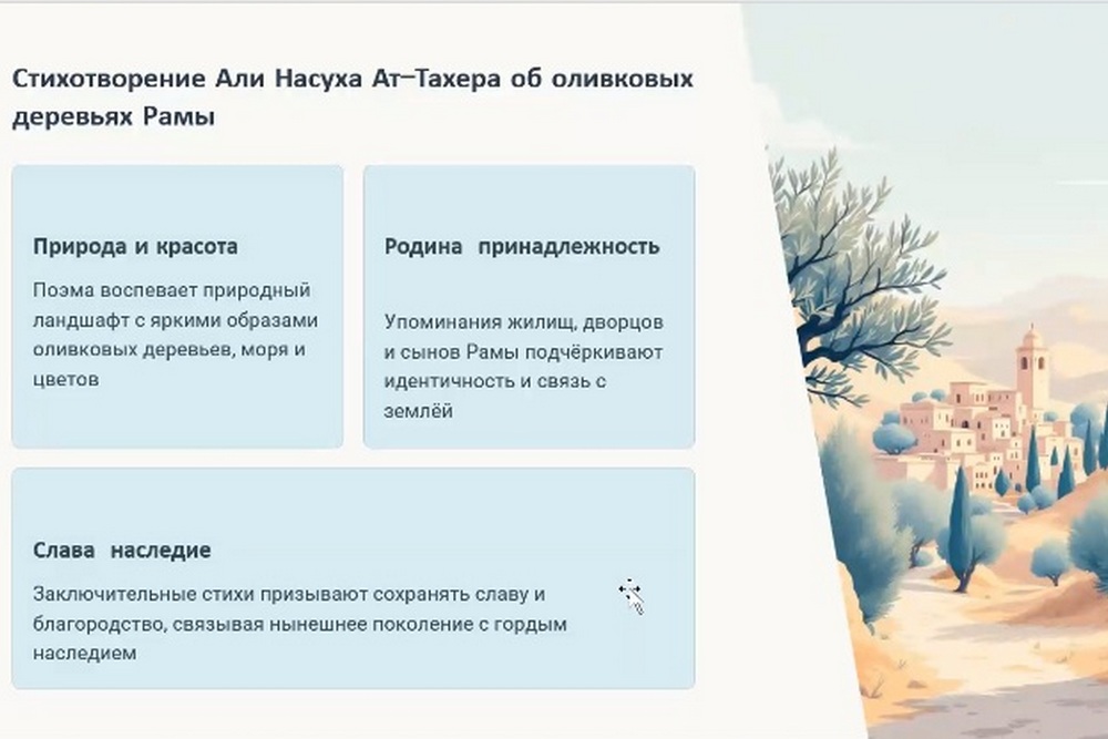 – Международный конкурс «Олива – символ мира» – это не просто художественная платформа. Это пространство культурного диалога, где творчество становится средством взаимопонимания между народами. Во всём мире оливковая ветвь воспринимается как знак гармонии, обновления и стремления к мирному сосуществованию. На фоне этой универсальной символики особую глубину приобретает значение палестинской оливы, занимающей центральное место в истории и культуре палестинского народа, – подчеркнула профессор Рехаб Аль-Саади.