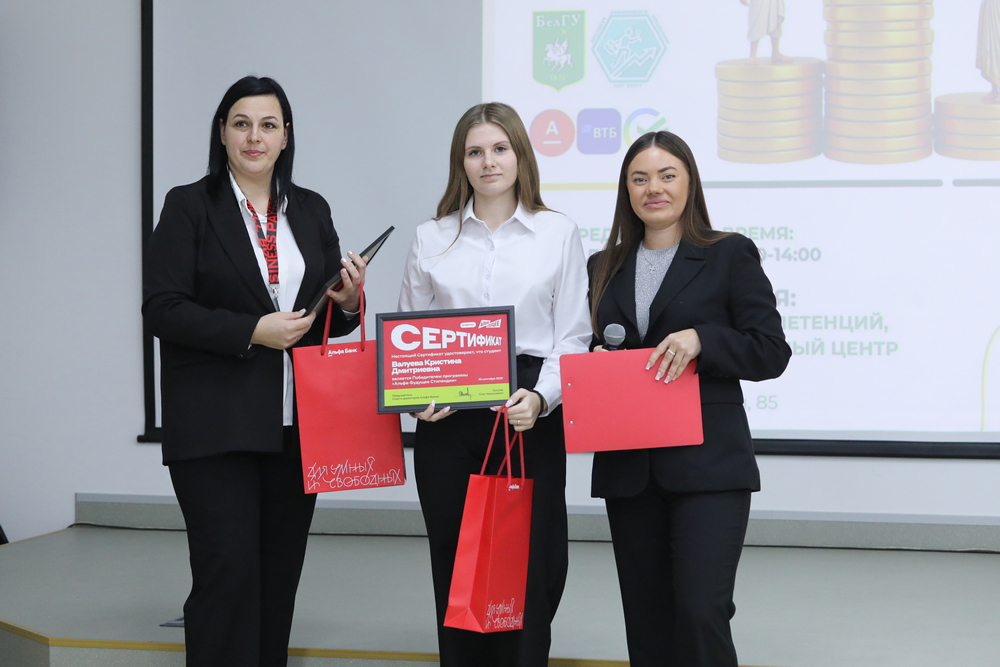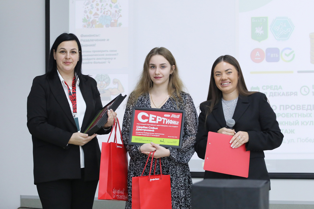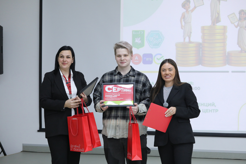 Также в ходе церемонии были отмечены призёры марафона по финансовой грамотности Банка ВТБ. Каждое полугодие ВТБ запускает цикл просветительских онлайн-курсов по всей стране, в которых участники постепенно осваивают и прокачивают навыки финансовой грамотности, разбирая темы, как защитить себя от мошенников, обрести финансовую свободу, управлять личным бюджетом и сделать первые шаги в инвестициях. Студенты НИУ «БелГУ» Юлия Левадная (институт экономики и управления), Диана Долинская (факультет психологии педагогического института) и специалист медицинского института Римма Ликарчук заняли призовые места в рамках марафона по финансовой безопасности. Они продемонстрировали высокий уровень знаний и практического понимания финансовых вопросов.