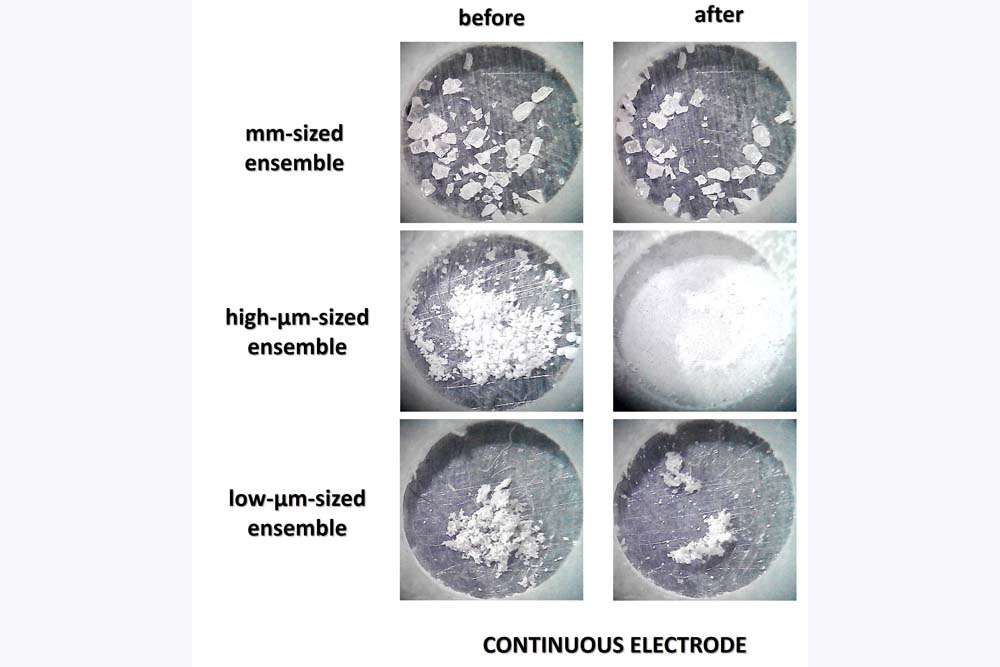 Эксперименты показали, что под действием внешнего электрического поля ансамбль частиц ниобата лития формирует упорядоченные поверхностные структуры – паттерны. Эти паттерны устойчивы и сохраняют свою форму даже после прекращения воздействия электрического поля, создавая условия для контролируемого изменения электрической поляризации в материале.