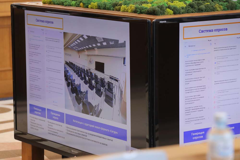 Алексей Пыхтин рассказал об имеющихся в этой системе элементах геймификации, в том числе внутренней игровой валюте, за которую можно приобретать виртуальные подарки внутри системы, а с недавнего времени – и карту сотового оператора – партнёра ЮЗГУ. Интегрированный искусственный интеллект позволяет автоматическое создание тестов для проверки усвоения материала после поведённого занятия. В тестовом режиме система, использующая данные с установленных в каждой аудитории камер позволяет отслеживать посещаемость и ход проведения занятий.
