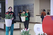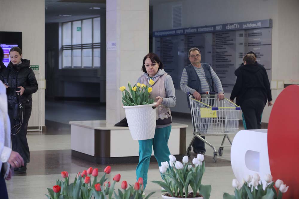 Фойе главного корпуса НИУ «БелГУ» по улице Победы встречает студентов, преподавателей, сотрудников и гостей университета пышным цветением тюльпанов и гортензии. Сотрудники ботанического сада вуза ежегодно радуют сотрудников и обучающихся к празднику 8 Марта – Международному женскому дню. Цветочные композиции разместили также в домовом университетском храме Архангела Гавриила.