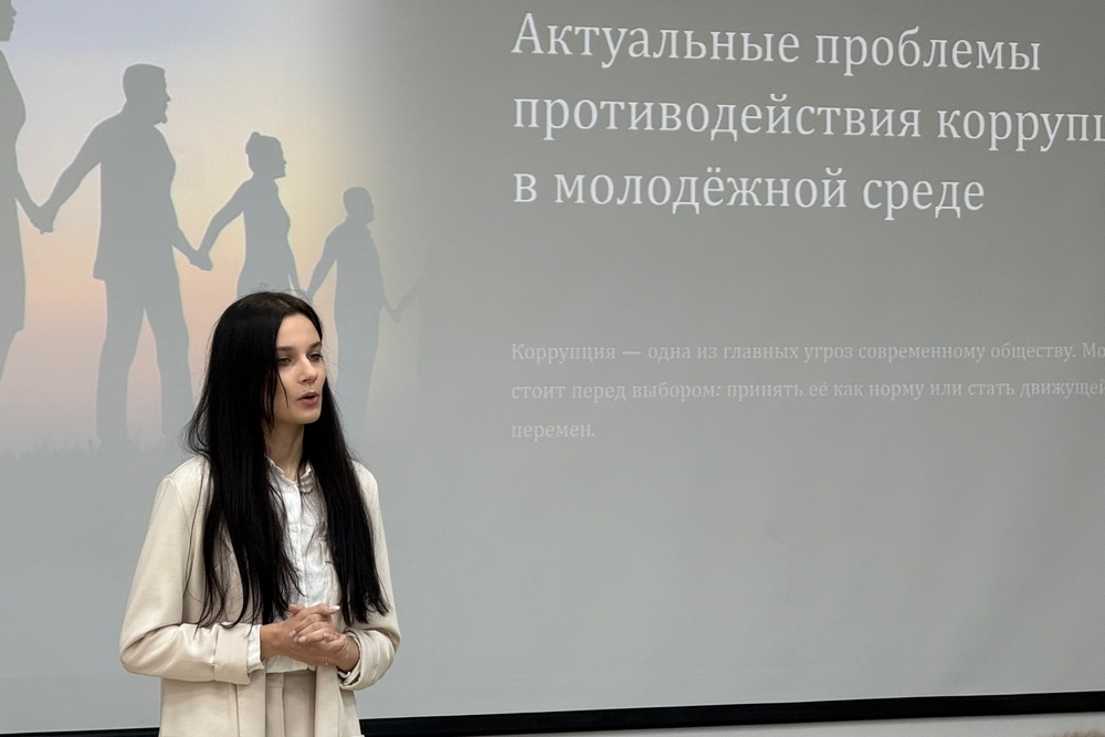 После ответов спикеров на интересующие вопросы, о деятельности Молодёжного антикоррупционного совета рассказала его председатель, студентка юридического института, Дарья Добровольская. Она представила основные направления деятельности объединения, его задачи и инициативы, направленные на формирование в студенческой среде неприятия коррупции, и пригласила всех заинтересованных обучающихся присоединиться к работе Совета.